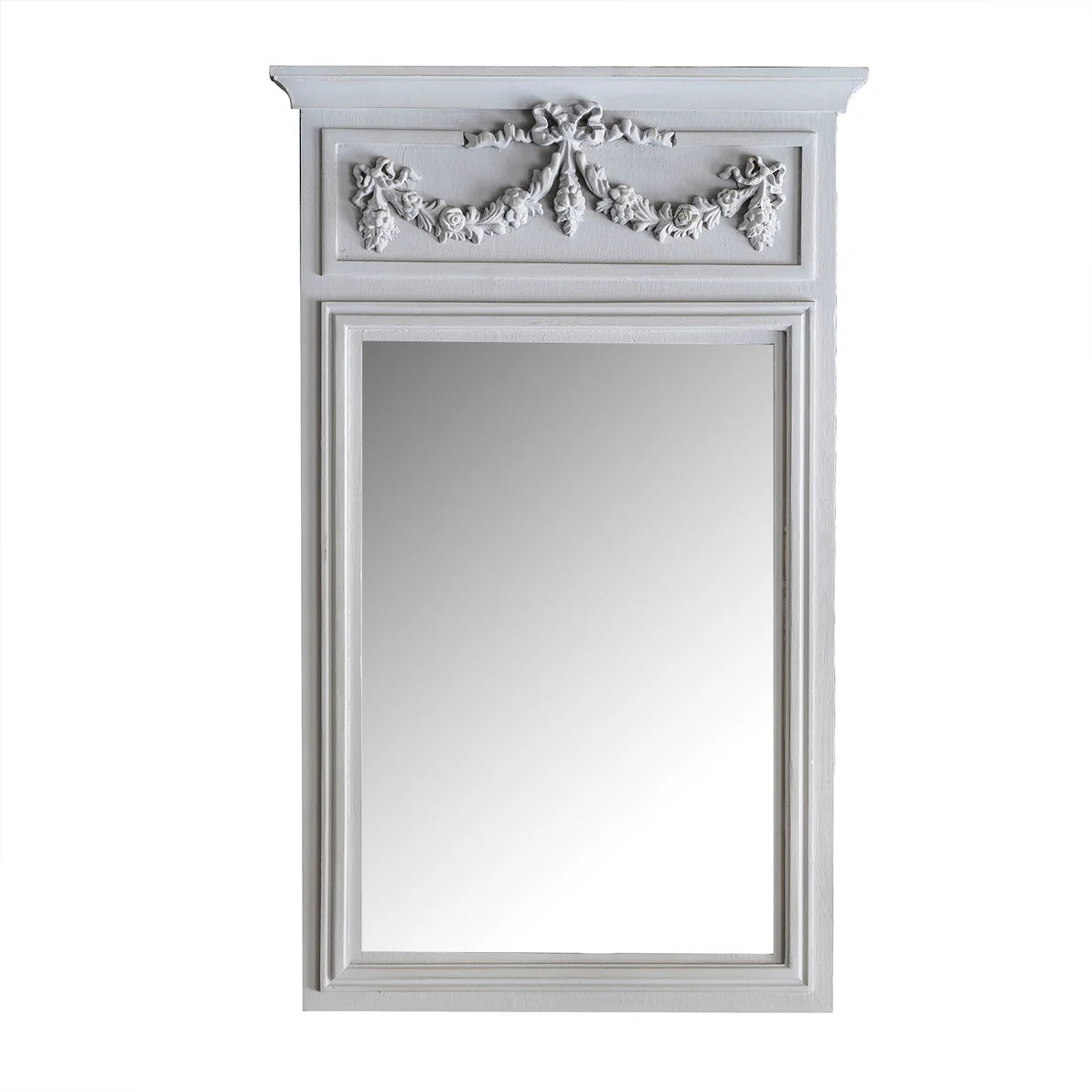 The French-inspired Caen Mirror takes its name from the northwestern shores of France. The rectangular mirror has a traditional edging all around with an extended decorative floral bunting design. The Caen Mirror is finished in an antique white and is fitted with a 5-millimeter-thick, flat mirror.