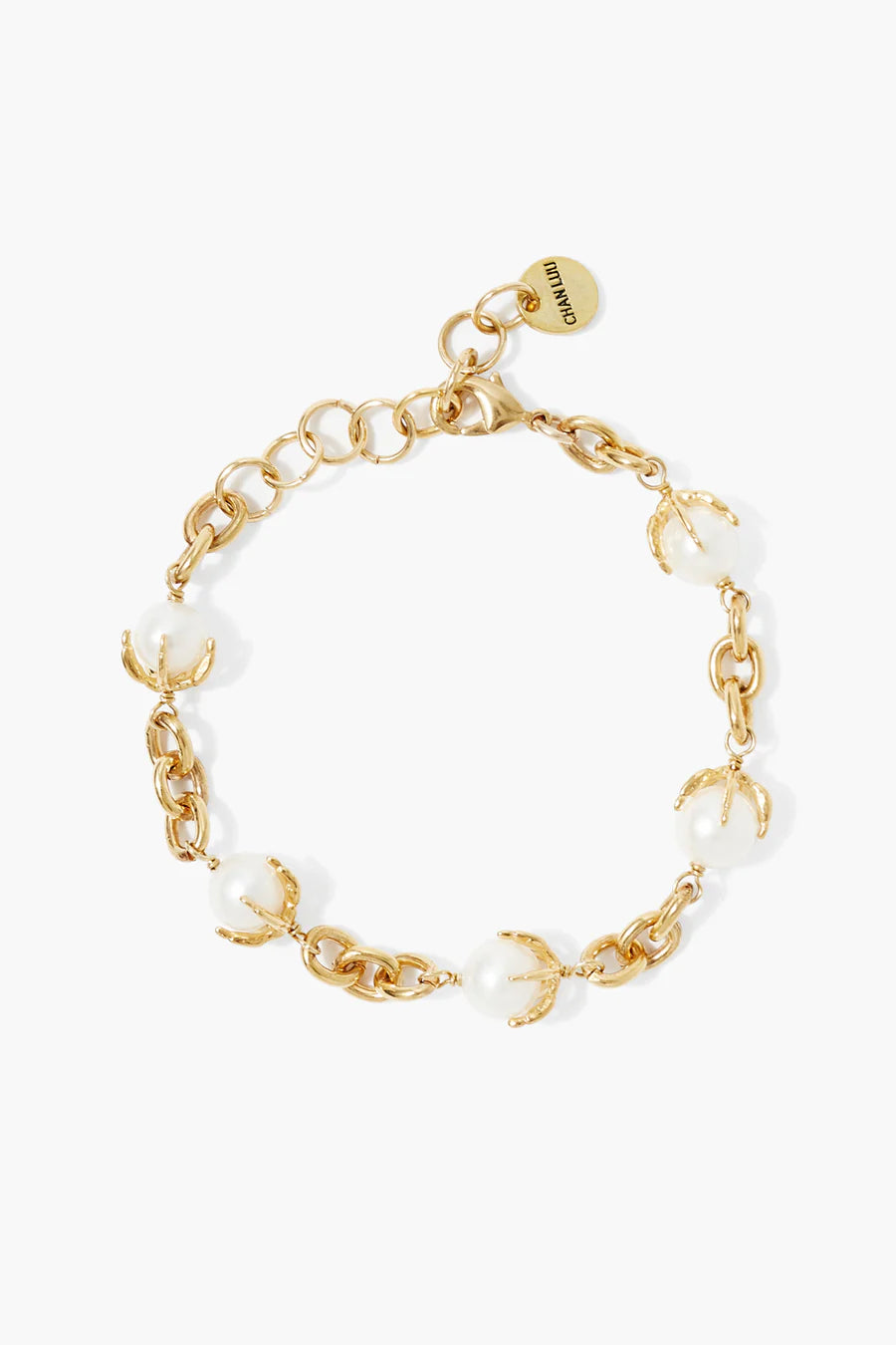 Gold plated brass chain bracelet with bird claw motif clutching freshwater pearls.