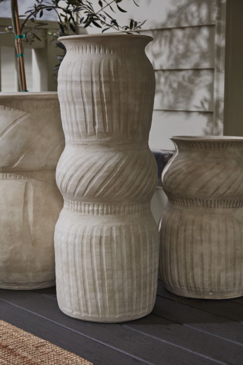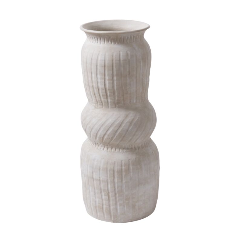 With its large size & old-world feel, the statement Delphine Vase is a stunning display of sculptural design & artisanal craftsmanship. Featuring organic, hand-carved linework around the body & a warm off-white finish with surface variation, this heavy, textured vessel is a beautiful standalone piece in an entryway or on a patio. Its generous size & curves beautifully complement large branches, fresh or dried stems, or even a small tree.