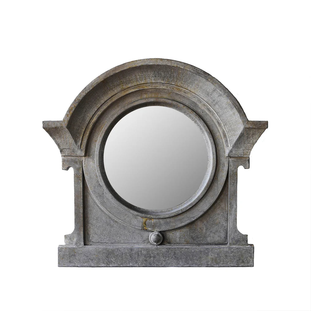 "While dormer windows began to grace the rooftops of 16th-century Britain, it wasn't until the 17th century that Parisian architecture made them more commonplace. Our vintage-inspired Dormer Mirror Small features a French-era style dormer facade with a round antique-finished mirror in place of a window. The iron and MDF framing is finished in an antique-washed grey." -Blue Ocean Traders