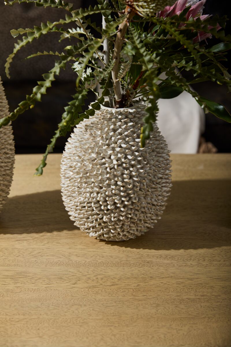 This collection belongs in a gallery of sculptural artwork, or at least in a home entryway. Each artisan-made ceramic Ismene Vase is unique with hundreds of intricate, handmade, hand-applied shell-shaped pieces across the elongated oval-shaped body. Heavy & sturdy for placement on the floor or a large surface, these vessels offer texture & versatility for styling with a branchy arrangements or seasonal florals