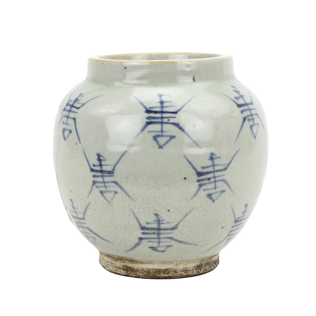 "The rustic, yet geometrically styled design of the Jingdezhen Hand-Painted Storage Jar with Characters works with a variety of aesthetics. This antique reproduction porcelain jar with a wide opening is an antique reproduction featuring a primitive collection of lines that have a scarab-like arrangement. The Jingdezhen Hand-Painted Storage Jar with Characters is crafted in Jingdezhen, China - a world-renowned region for high-quality ceramics." - Blue Ocean Traders
