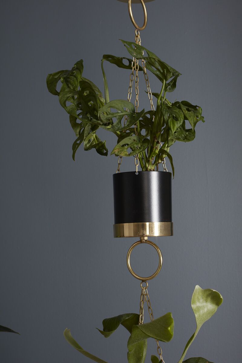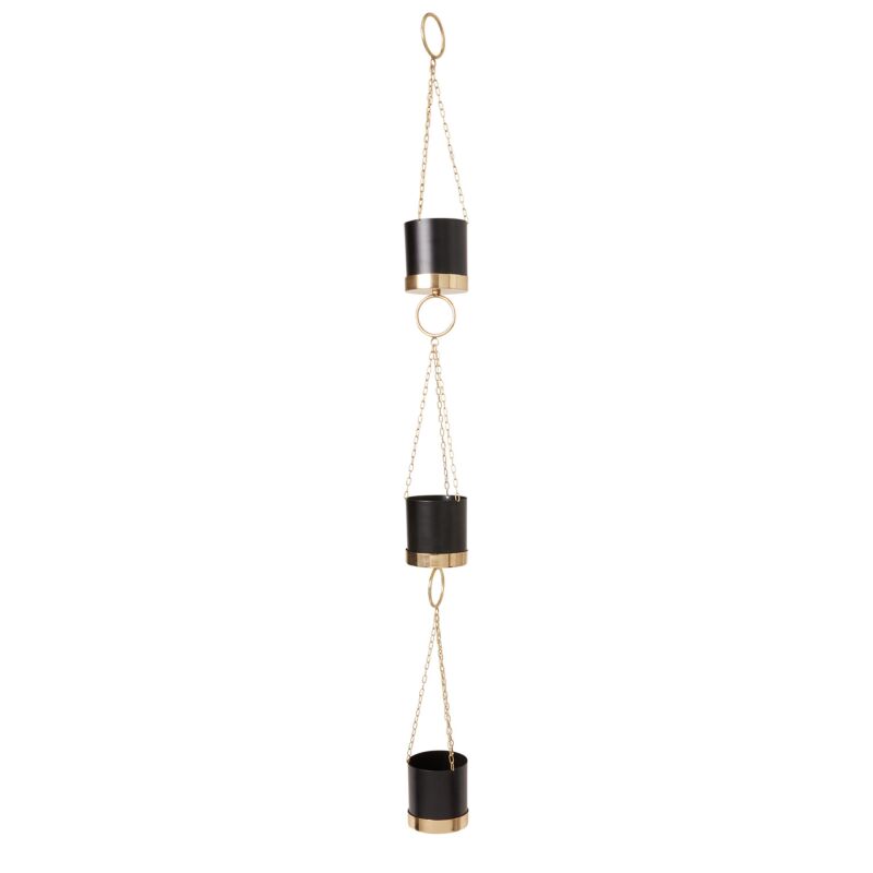 The long black & gold Karo set of 3 hanging pots offer your decor a modern feel, with an art-deco nod to the past. With gold rings & a long gold chain, these pots add a sleek dimension to the room (and saves space for multiple plants).