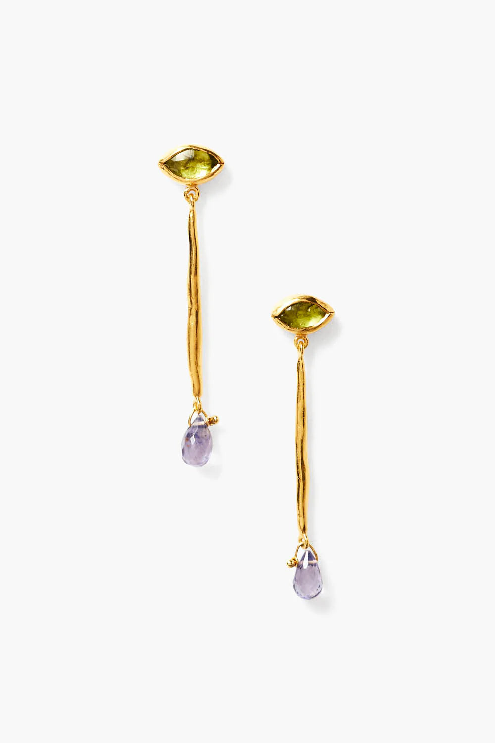 Drop earring featuring a hand-cut peridot marquise, gold bar, and iolite drop.