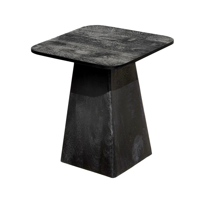 The Noch Tables Collection is bold in color and shape. Finished in a rich dark brown, the Noch Side Table is crafted from long-lasting mango hardwood. The 16-inch square tabletop has rounded edges and sits atop a central, cow-bell-shaped base. The geometrically inspired piece captivates with its simple juxtaposition.