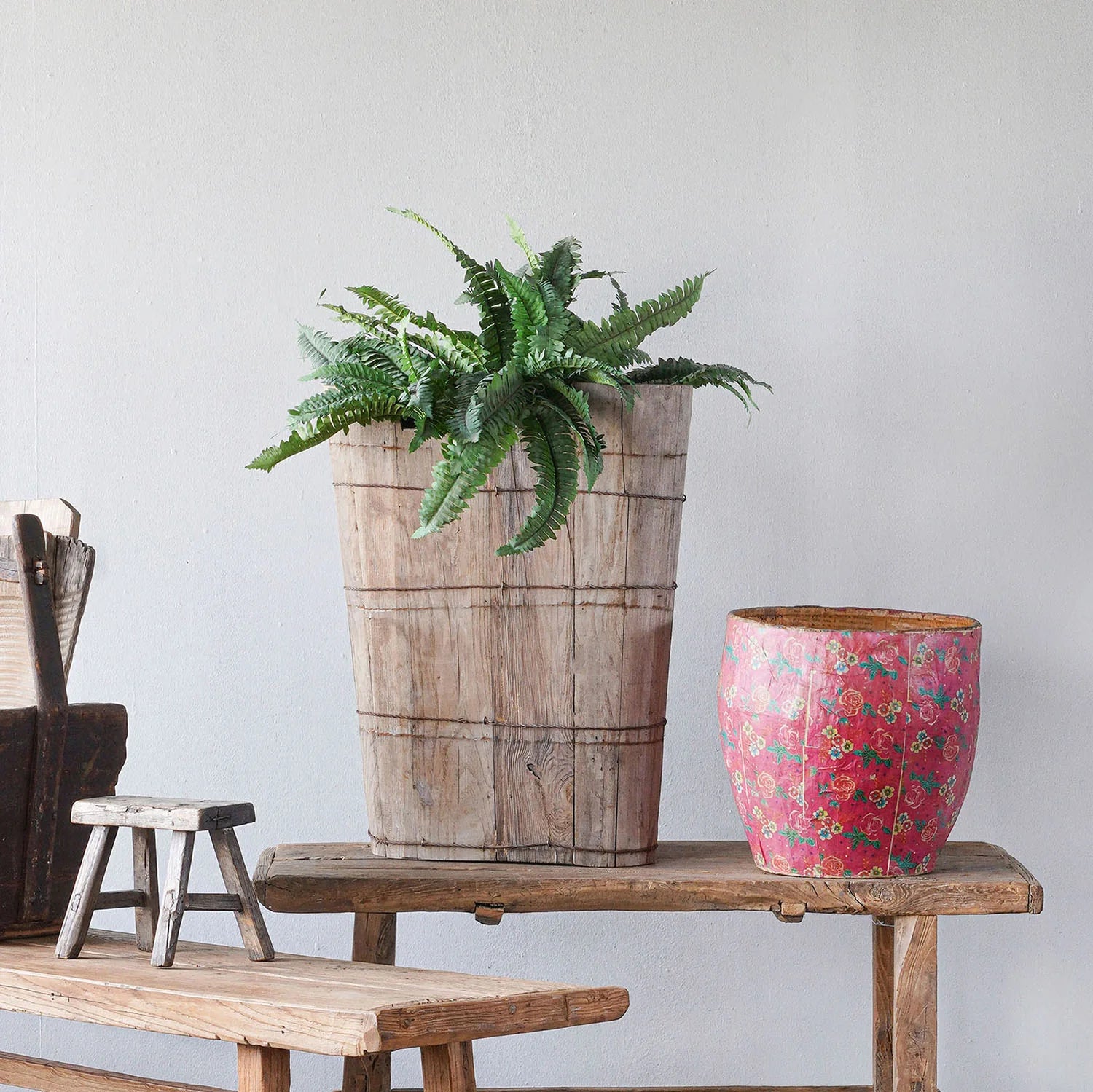 Long before backpacks were abundant, village life still called for the transport of goods by old-fashioned carrying. For more unwieldy items, the tall Villagers Grape Hod bucket was a great resource. This vintage, pine-crafted bucket includes two shoulder straps - remnants of a bygone era. The Villagers Grape Hods are sourced from the southwestern Yunan Province of China.